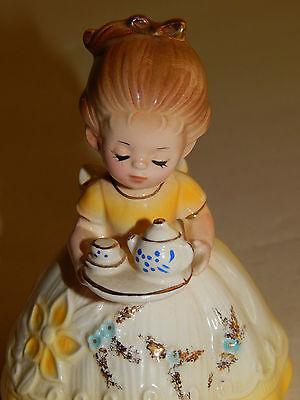 VINTAGE JOSEF ORIGINALS FIGURINE GIRL IN YELLOW DRESS SERVING TEA W/ LABLES EUC