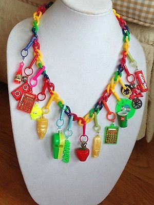 Title (ebay affiliate link): Vintage 80's Plastic Bell Charm Necklace Strawberry Whistle Tetro Clip on