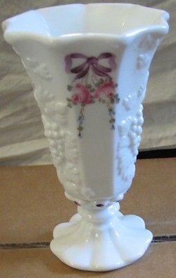 Title (ebay affiliate link): VTG WHITE MILK GLASS VASE HARVEST GRAPE & FLORAL PATTERN FOOTED 5-3/4'' VASE