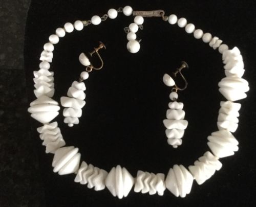 Title (ebay affiliate link): Rare Vintage Milk Glass Beaded Demi Parure Choker Screw Back Earrings