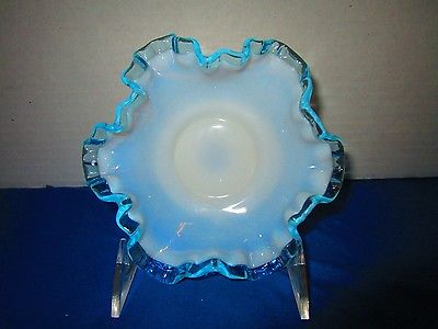 Vintage Fenton Glass Aqua Crest Milk Glass Double Crimp 6" BonBon