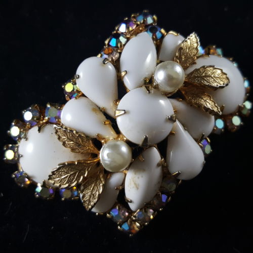 Title (ebay affiliate link): JULIANA Vtg Brooch Pin White Milk Glass Cabochon Faux Pearl Rhinestone U181