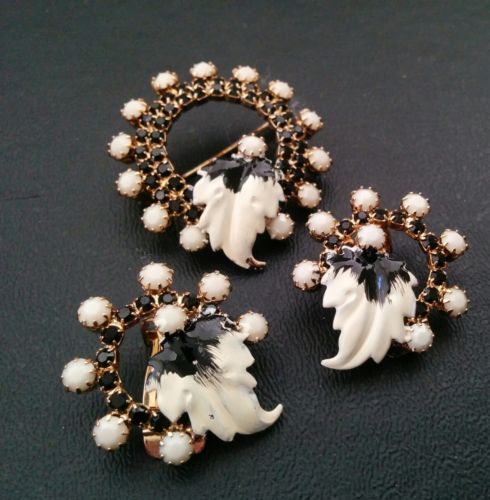 Title (ebay affiliate link): Vtg Mourning Milk Glass Rhinestone Enamel Flower Brooch Pin Earring SET Q67