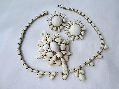VINTAGE White Milk Glass RHINESTONE Pin BROOCH Clip EARRINGS & NECKLACE LOT