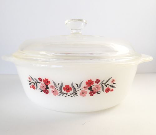 Title (ebay affiliate link): Vintage Fire King MilK Glass Primrose Flowers 1qt Casserole Dish Pyrex /Lid