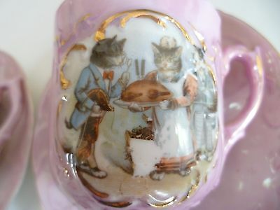 2 Vintage CAT kITTIES Cups & Saucers PINK IRIDESCENT LUSTRE