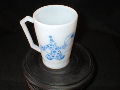 White Milk Glass Mug Decorated w/ a blue clown ea.side