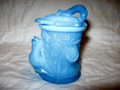 BLUE SONG BIRD IN TREE STUMP,BLUE MILK GLASS, CONDIMENT