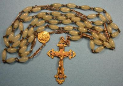 VINTAGE BRASS MILK GLASS BEAD CATHOLIC ROSARY