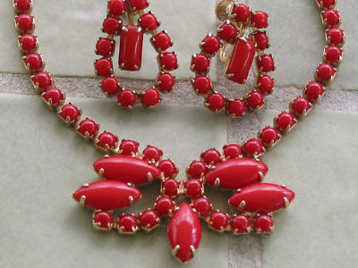 Red Cabochon MILK GLASS Necklace & Earrings SET