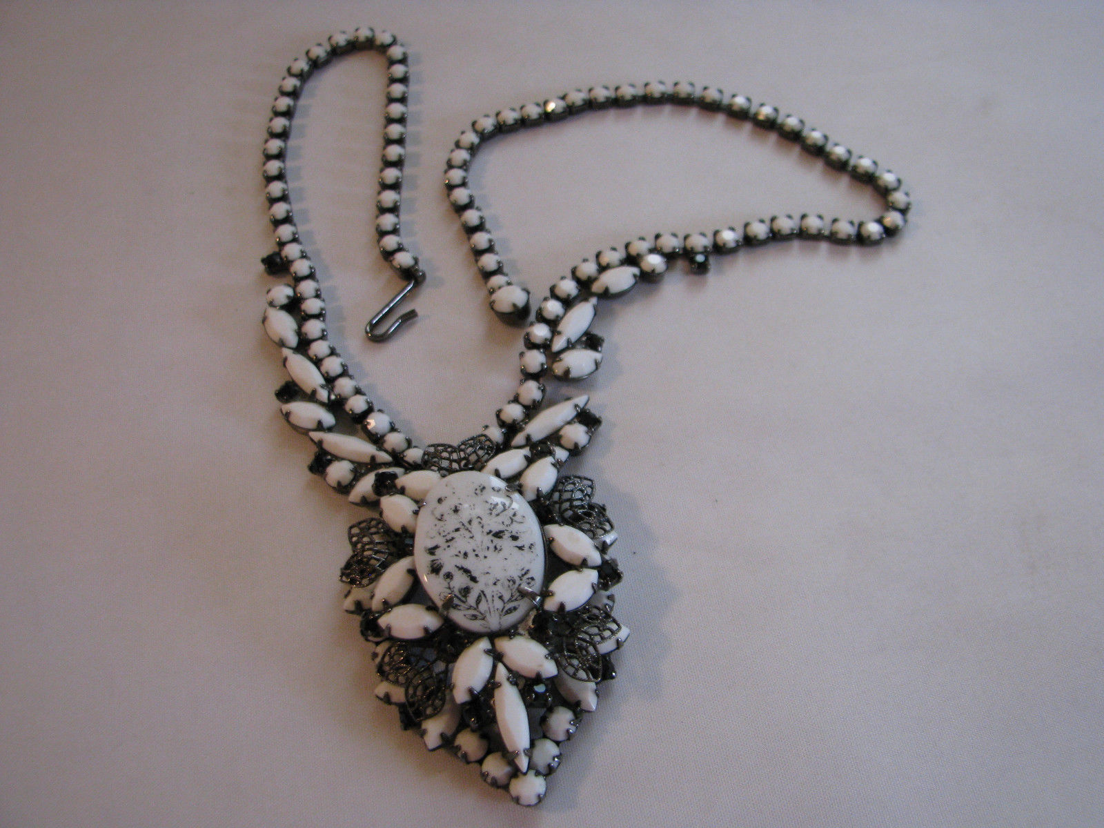 Title (ebay affiliate link): VINTAGE 1950'S WHITE MILK GLASS 24" NECKLACE MILK GLASS CABOCHON BLACK RS ST PEN