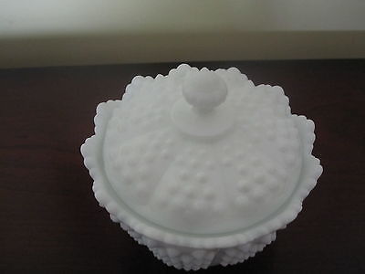 Title (ebay affiliate link): FENTON WHITE MILK GLASS HOBNAIL CANDY DISH w/ LID SIGNED COVERED BOX,