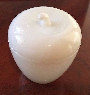 Title (ebay affiliate link): Vintage Hazel Atlas Apple Shaped Jelly Jam Jar White Milk Glass Trinket Sugar