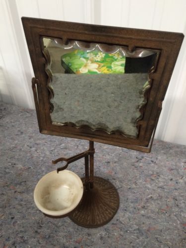Title (ebay affiliate link): Antique 1900's Metal Shaving Stand, Cast Iron, Mirror, Milk Glass Bowl