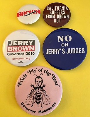 Title (ebay affiliate link): Lot of Five Pro and Anti-Jerry Brown Pinback Buttons