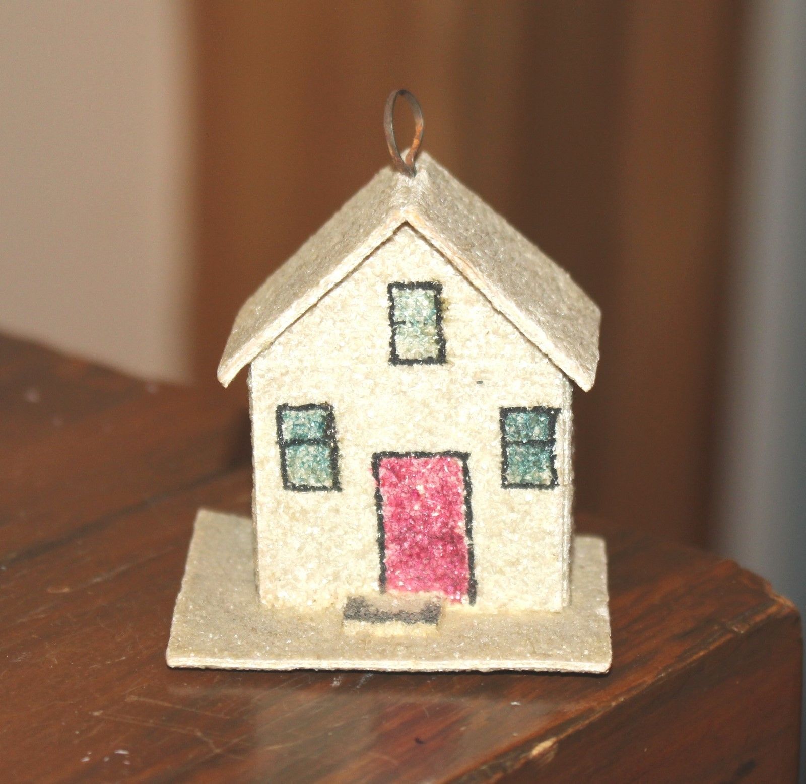 Title (ebay affiliate link): 2nd. Czechoslovakian Snow Flocked Cardboard House Ornament. 1930s, paper label