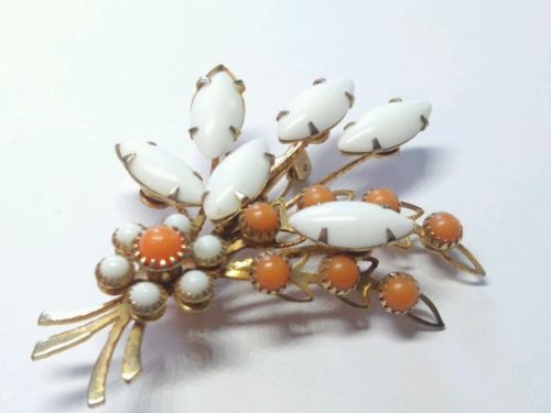 Title (ebay affiliate link): VTG PIN NAVETTE FRONT PRONG MILK GLASS FAUX CORAL FLOWER BOUQUET BROOCH