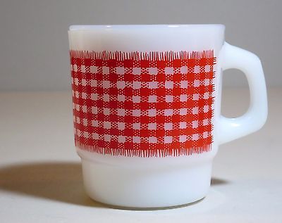 Title (ebay affiliate link): FIRE KING Mug - RED Gingham plaid - Milk Glass - stackable Anchor Hocking - USA