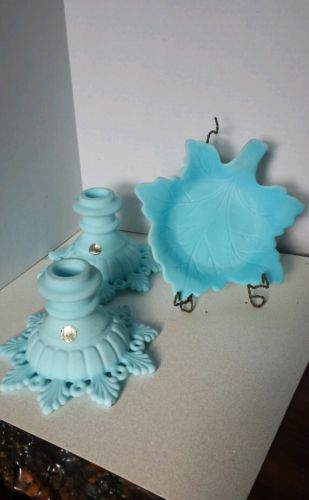 Title (ebay affiliate link): Vintage Westmoreland Blue Milk Glass Candle Holders and Candy Dish
