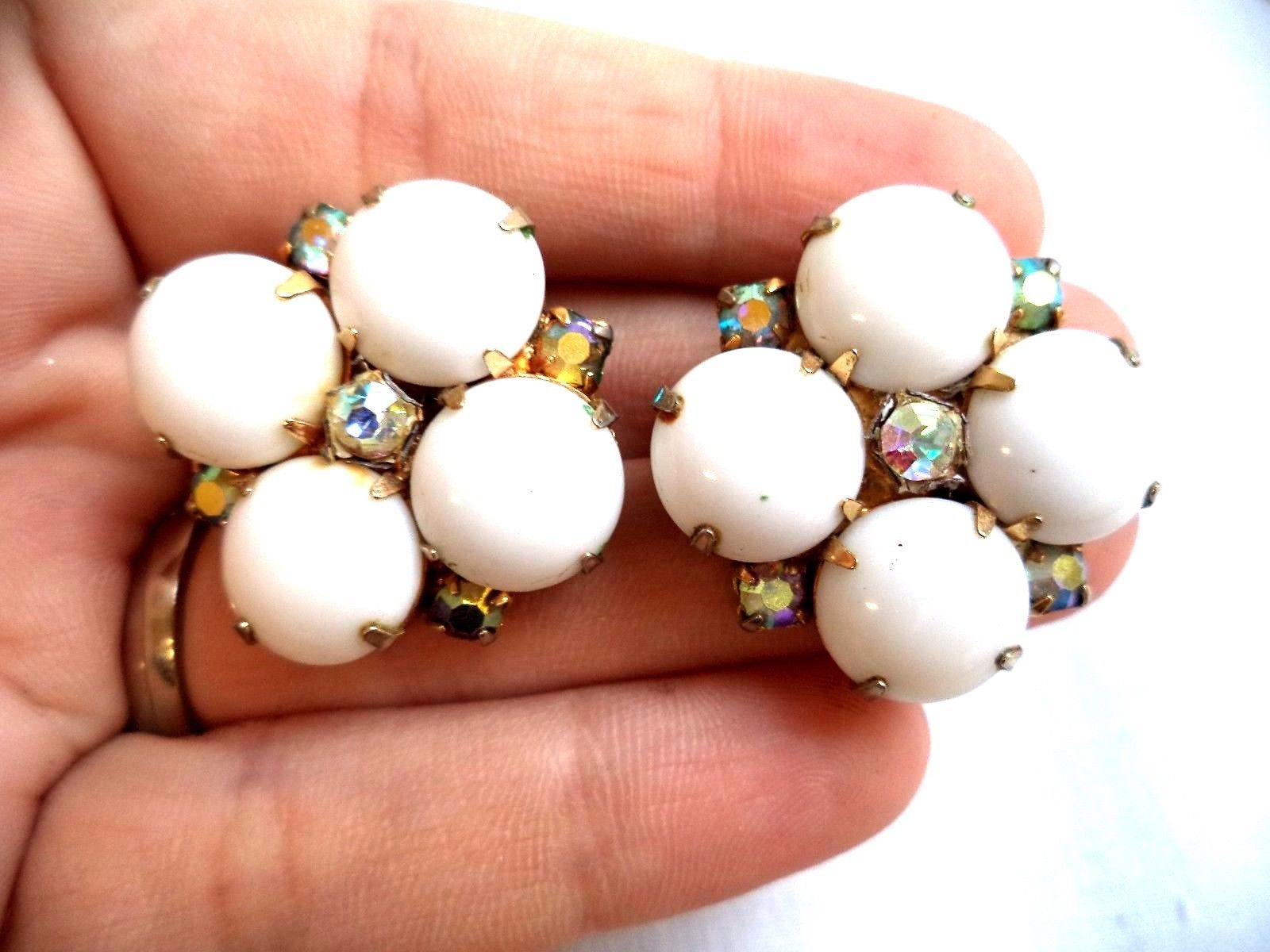 Title (ebay affiliate link): STUNNING VINTAGE ESTATE SIGNED WEISS MILK GLASS CAB RHINESTONE EARRINGS!!! 5272A