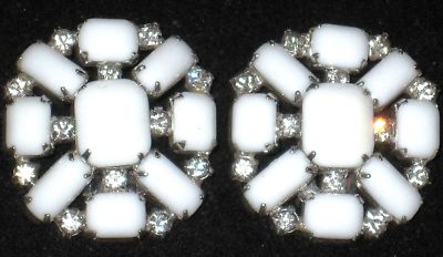 KRAMER White Milk Glass & Rhinestone Clip Earrings