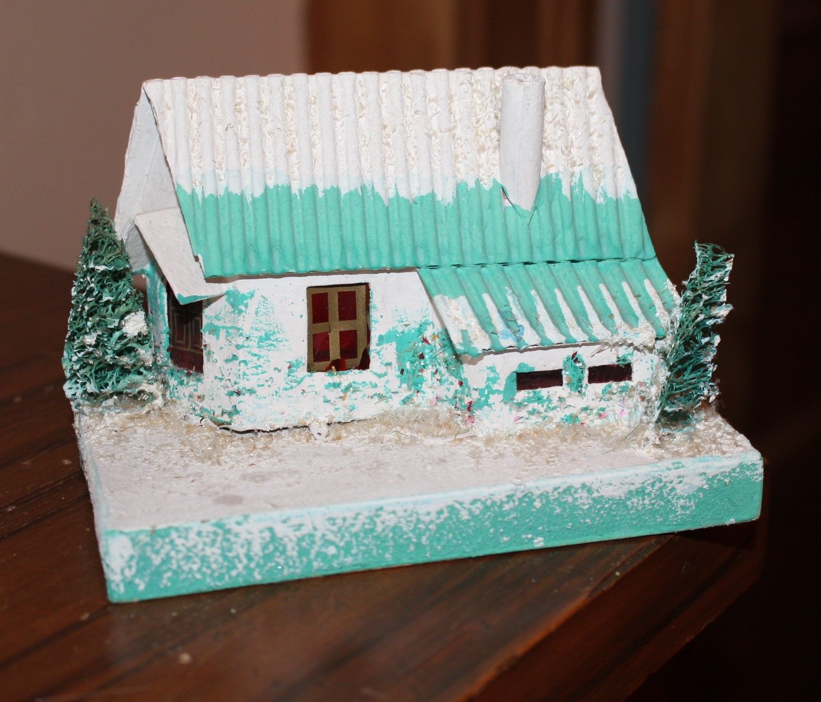 Title (ebay affiliate link): Larger Green Long Putz Village House. Sponge Trees, Windows. Japan. Late 1930s