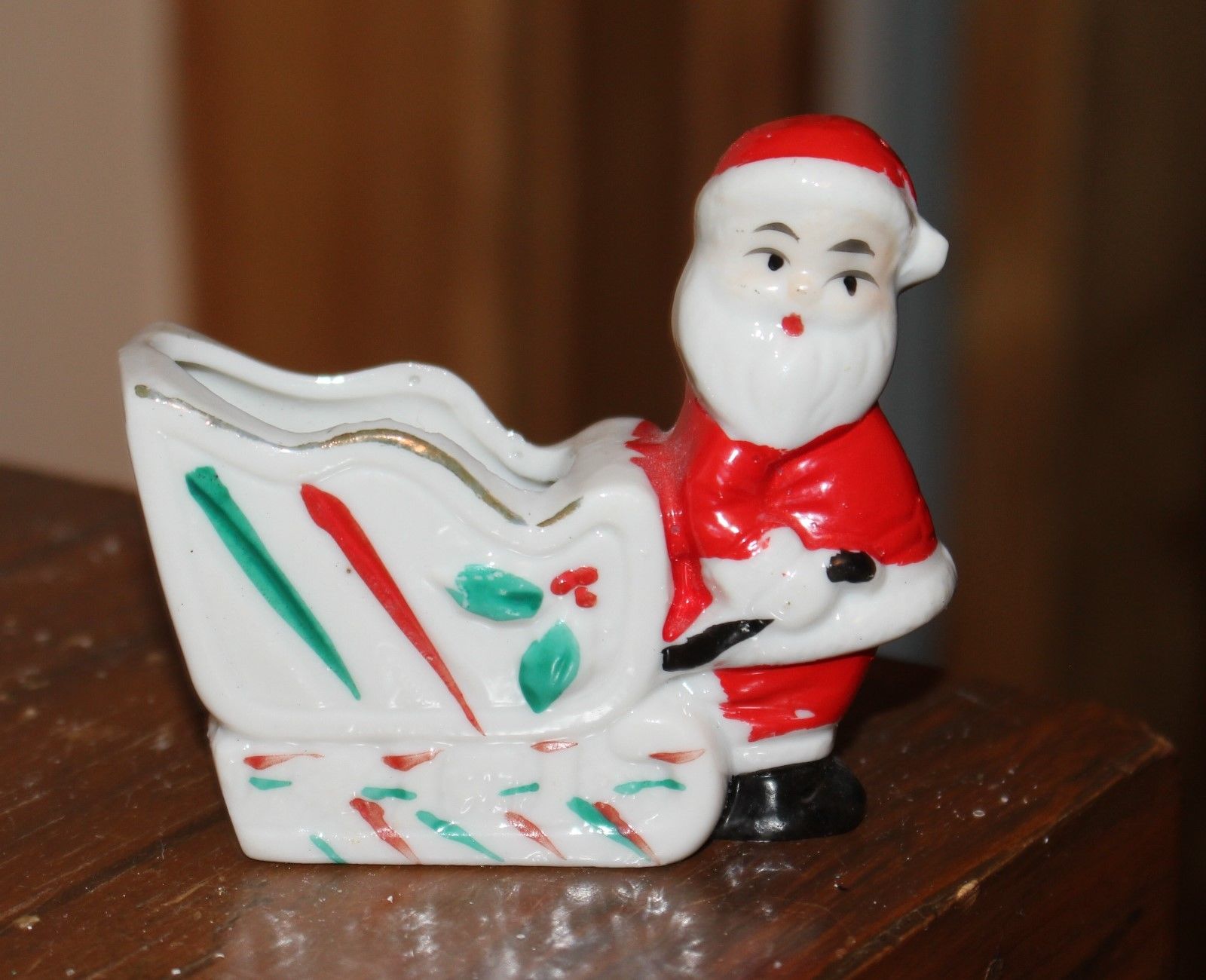Title (ebay affiliate link): Santa pulling Sled, larger than he is. Miniature Ceramic Figure. Japan.