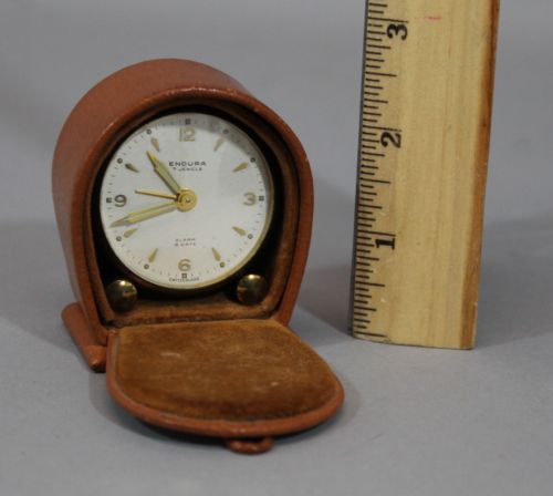 Title (ebay affiliate link): Vintage Miniature Modernist Swiss ENDURA 7-Jewels 8-Days Travel Alarm Clock