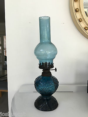 VINTAGE SMALL BLUE GLASS OIL LAMP BLUE CHIMNEY