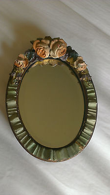 Small Oval Barbola Mirror with Stand Pink Roses Green Ribbon Frame Bevel Glass