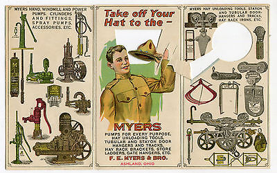 ARTICULATED WWI SOLDIER & HAT 6-PAGE TRADE CARD - FARM EQUIPMENT ASHLAND OHIO