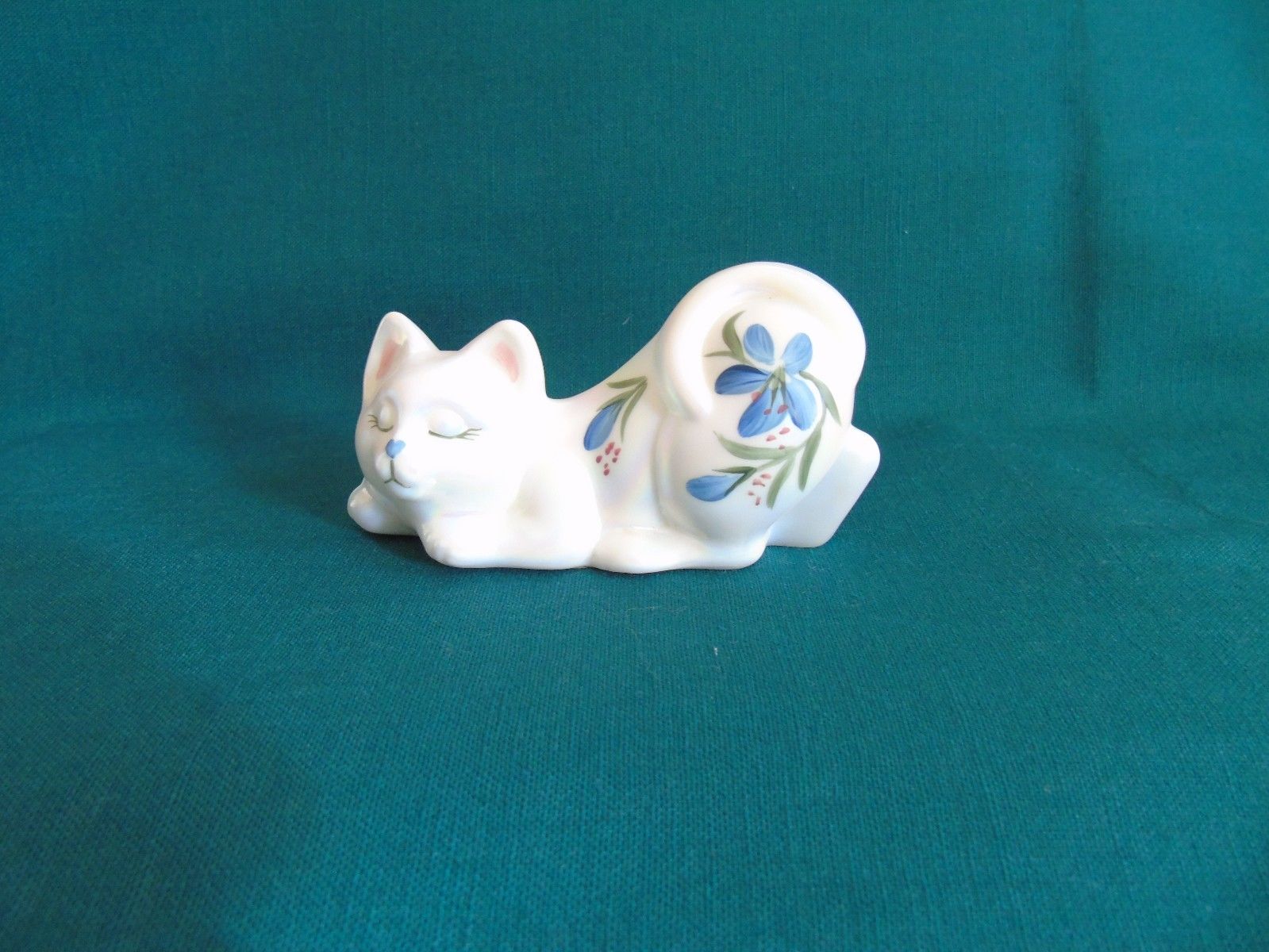 Title (ebay affiliate link): FENTON IRIDIZED MILK GLASS CROUCHING CAT HP WITH BLUE FLOWERS - WARE #C5119 SR