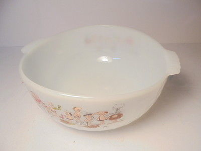 Title (ebay affiliate link): Vtg 9" Anchor Hocking Fire King B.C. Caveman Comic Strip Pebbled Milk Glass Bowl