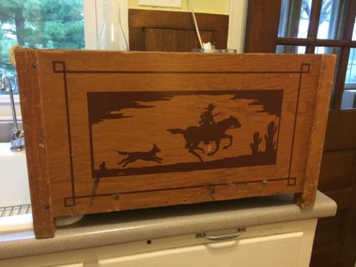 Title (ebay affiliate link): Vintage Cowboy Old Western Wood Toy Box Wooden Chest Trunk