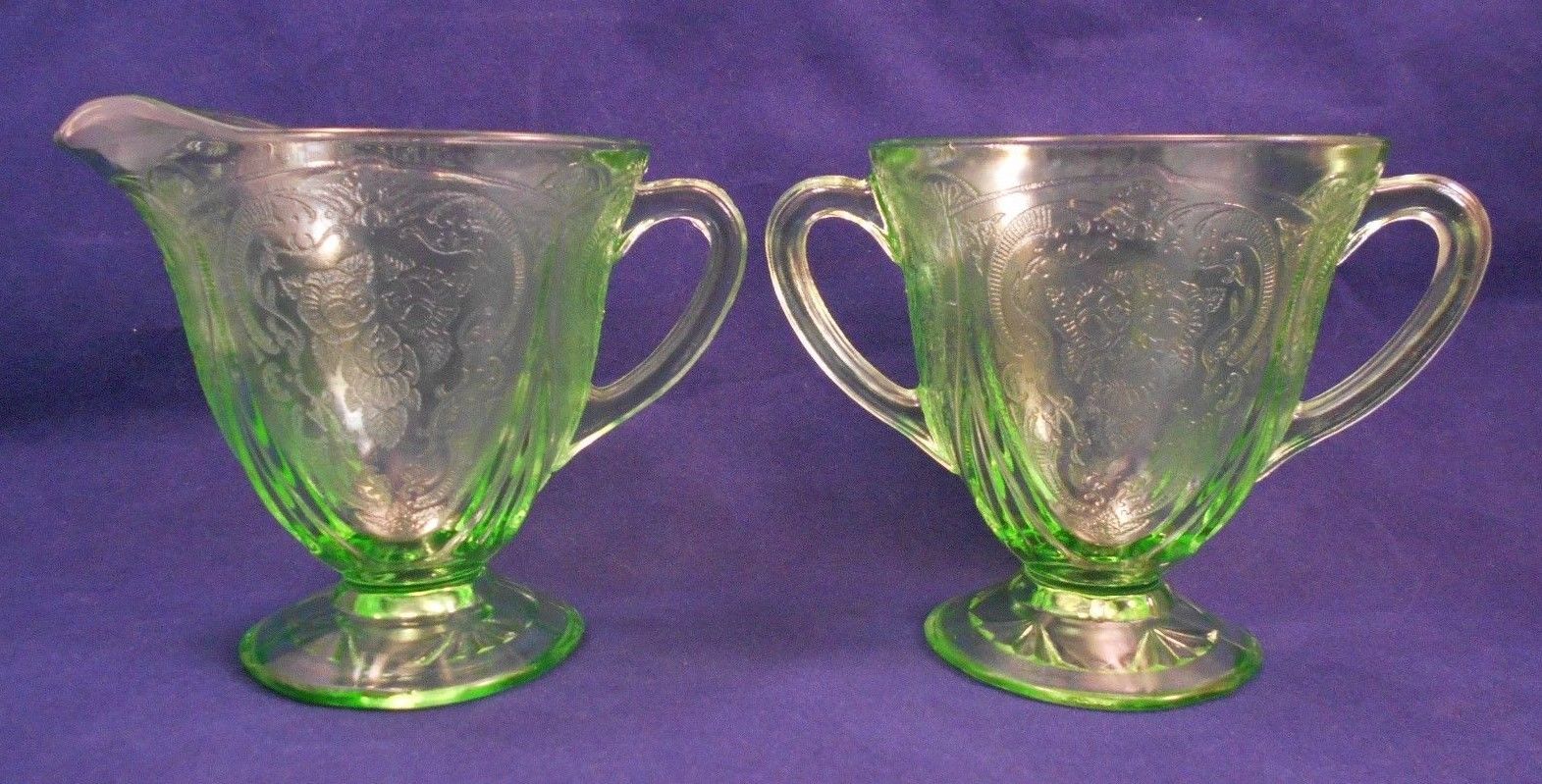 Hazel Atlas Green Royal Lace Footed Creamer & Sugar