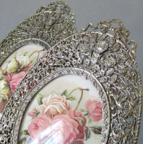 Title (ebay affiliate link): Pr Vintage Fancy Silver FILIGREE Frames ROSES + BOWS w DOMED Glass Baskets ROSES