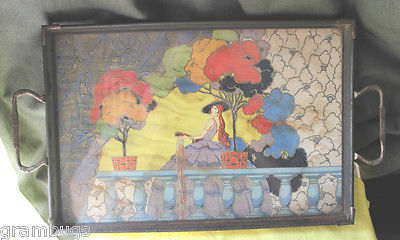 Vintage Antique Metal Tray & Glass Hand Painted Flowers & Lady