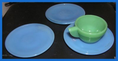 4pc Akro Agate CONCENTRIC RING plate cup lot blue Green