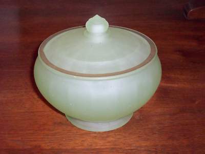 VINTAGE GREEN FROSTED SATIN GLASS POWDER JAR GLOWS EUC