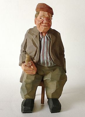 Vintage TRYGG Hand Carved Wood MAN on Stool with Bottle of KLD Oil 5.5"