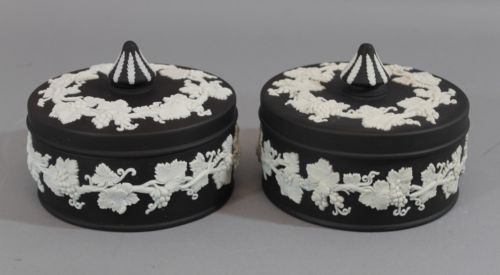 Title (ebay affiliate link): Pair Vintage Black Basalt Wedgwood Pottery Grape-Vine Covered Jar Boxes NR
