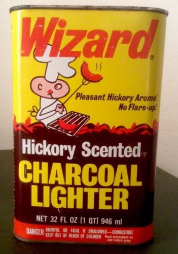 Title (ebay affiliate link): Vintage WIZARD HICKORY SCENTED Charcoal Lighter Starter Fluid for BBQ can 32oz