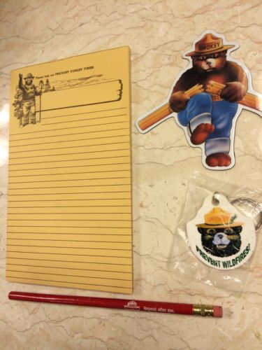 Title (ebay affiliate link): Vintage Lot Smokey Bear Note Pad, Magnet, Key Chain & Pencil