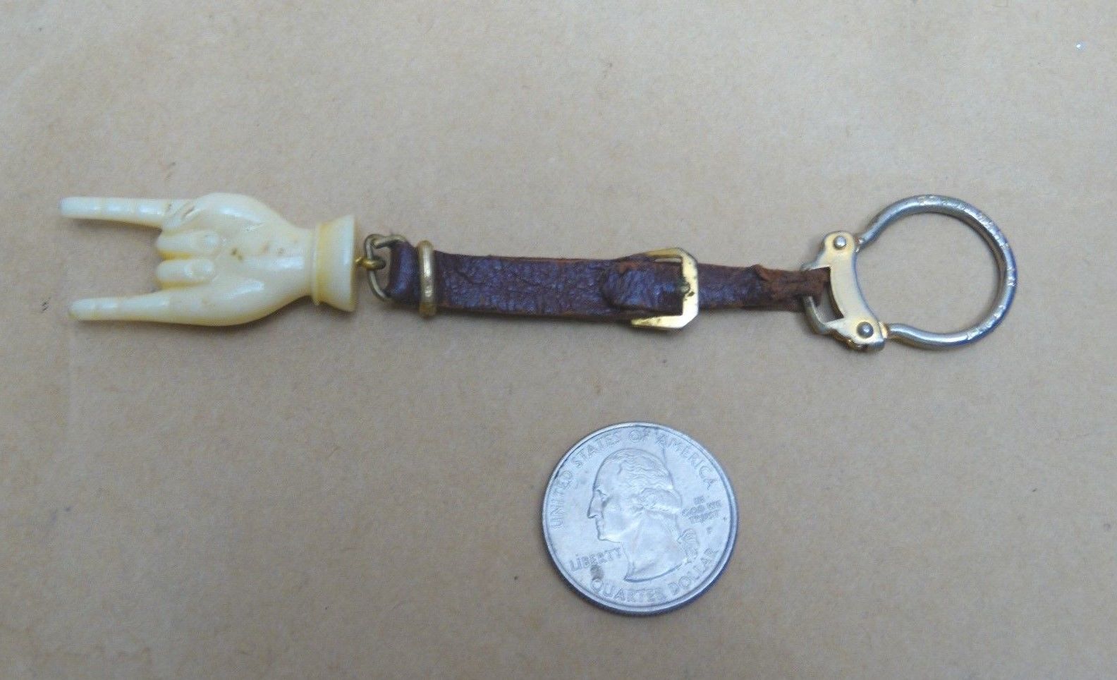 Title (ebay affiliate link): VINTAGE 50's KEYCHAIN LEATHER STRAP, ROCK ON, HOOK EM HORNS OR AC/DC IN TOWN