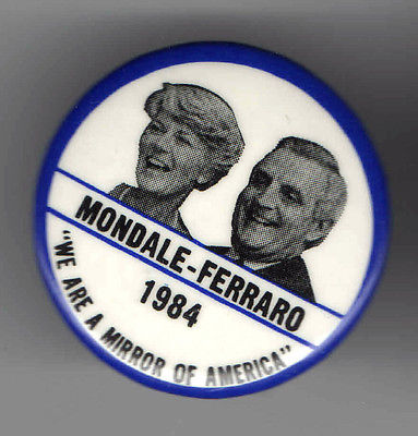 Title (ebay affiliate link): 1984 pin MONDALE + FERRARO Unusual Jugate pinback A mirror of America