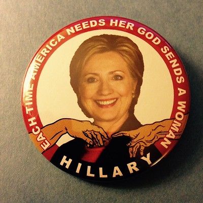 Title (ebay affiliate link): Each Time America Needs Her God Sends a Woman Hillary Pinback Button