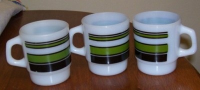 VINTAGE FIRE KING GREEN & BLACK STRIPED MILK GLASS MUGS