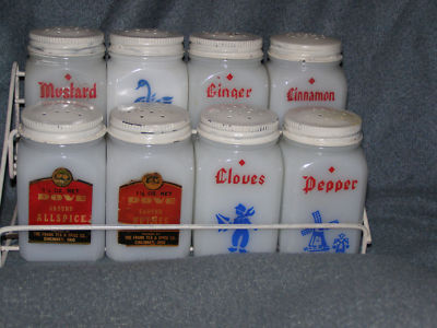 VINTAGE SPICE JARS AND RACK,DOVE ALLSPICE.MILK GLASS