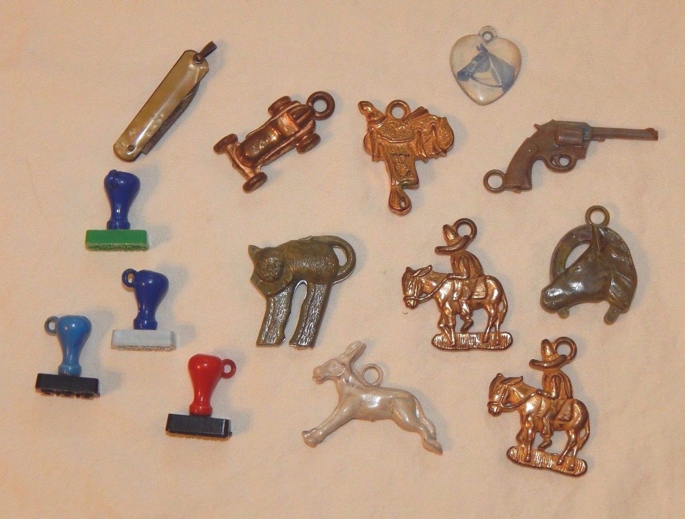 Vintage set of 14 bubble gum charms premiums pocket knife cowboy pistol race car