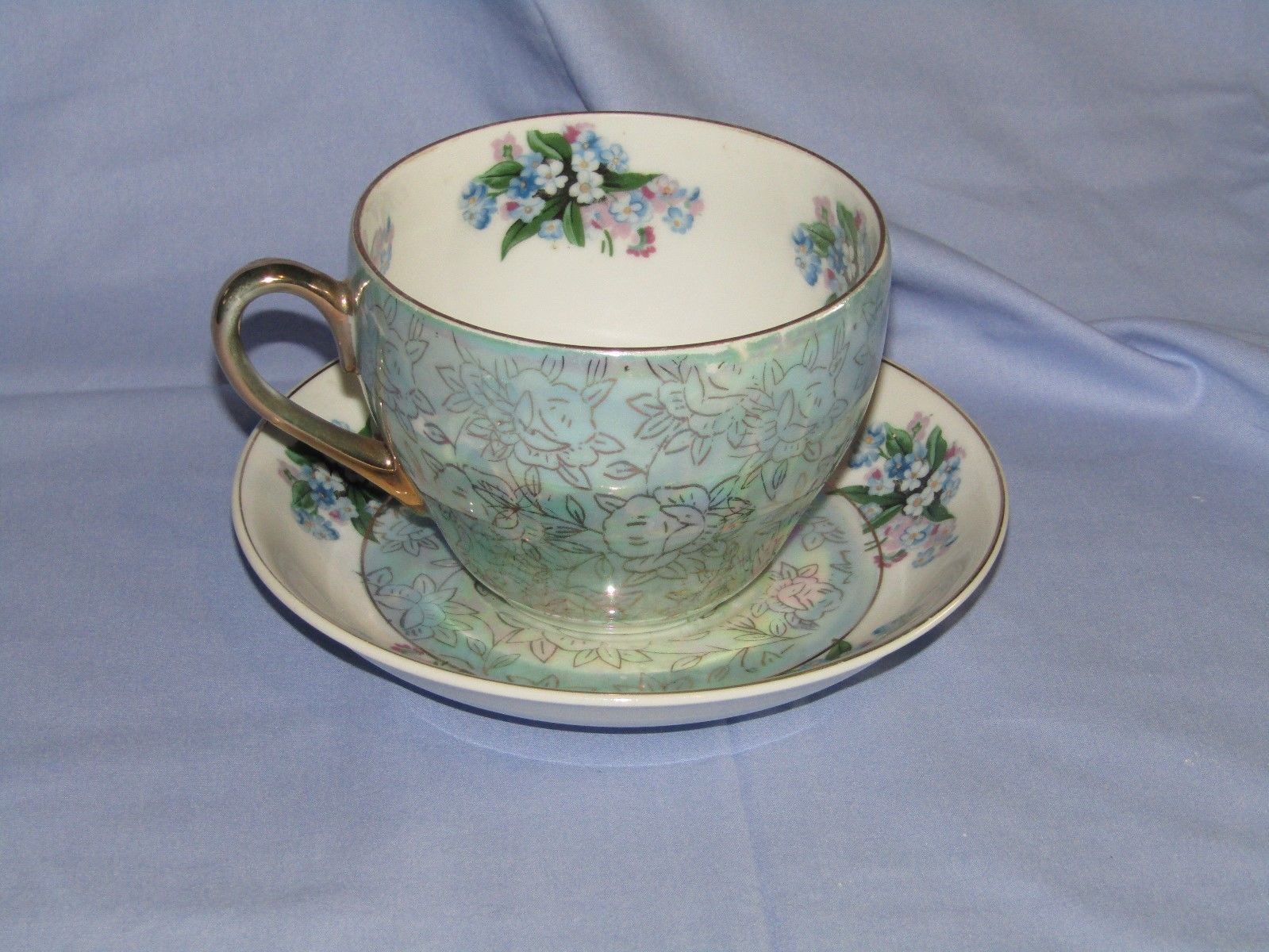 Title (ebay affiliate link): Vintage Made in Japan - Shiny Bluish-Green Floral Pattern Large Cup & Saucer